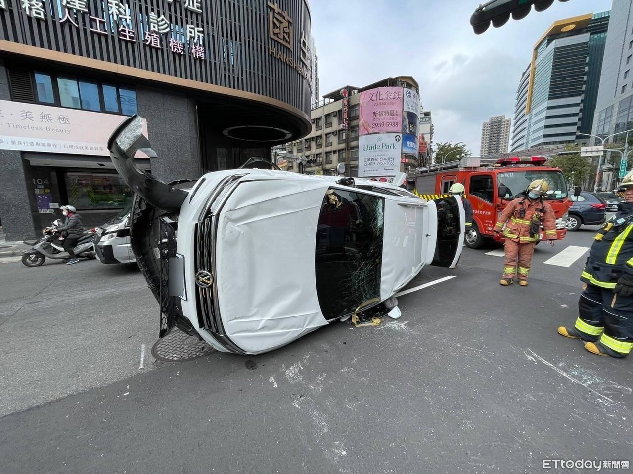 新北市板橋區中山路一段與民權路交叉路口,10日上午11時許,一部白色休旅車不名原因自撞翻覆,車內20多歲的男駕駛、女乘客受困,經警消到場將2人救出,經送醫2人僅肢體擦挫傷,沒有生命危險,詳細原因待調查。