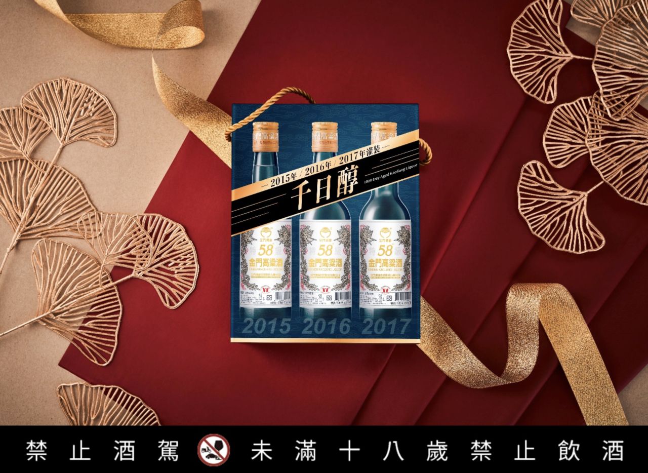 ▲2015~2017年份58金高千日醇垂直年份組,內含300ml 58金高千日醇2015至2017年3瓶入,一次擁有陳放4年以上的老酒,不論送禮或收藏皆為首選。