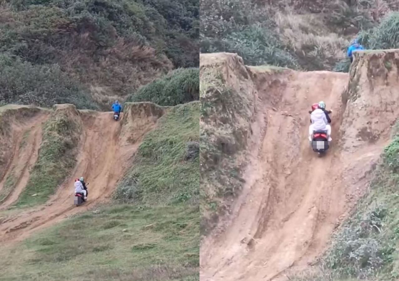 原PO在臉書「重機車友❘各區路況、天氣回報中心」轉貼影片,可以看見2輛機車準備翻越一處仰角超過50度的土坡,前方的藍衣騎士率先衝上去,只在最陡峭的地方搖晃了一下,最後成功爬上土坡。
