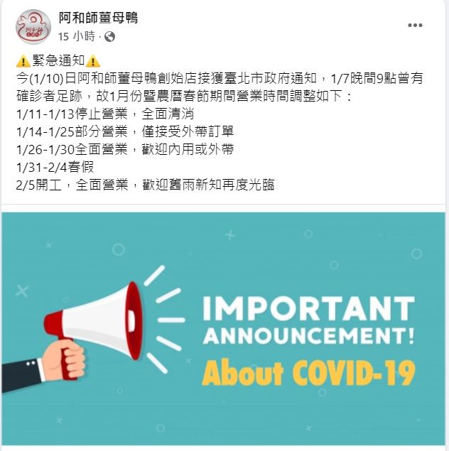 阿和師薑母鴨創始店於粉專發出緊急通知: