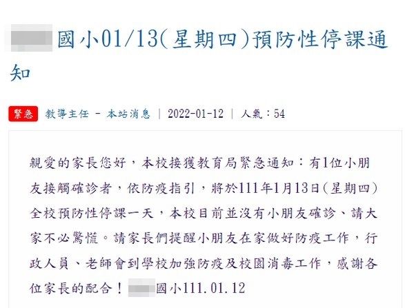 有學校公告指出,接獲教育局緊急通知,有一名學童接觸確診者,依防疫指引,將於111年1月13日全校預防性停課一天,「本校目前並沒有小朋友確診、請大家不必驚慌。請家長們提醒小朋友在家做好防疫工作,行政人員、老師會到學校加強防疫及校園消毒工作,感謝各位家長的配合!」