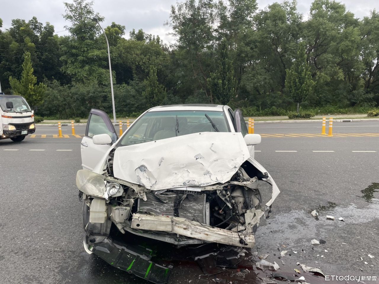 ▲2輛白色自小客車迎面擦撞,均受損嚴重,2駕駛分別送醫。(圖/新城分局提供,下同)