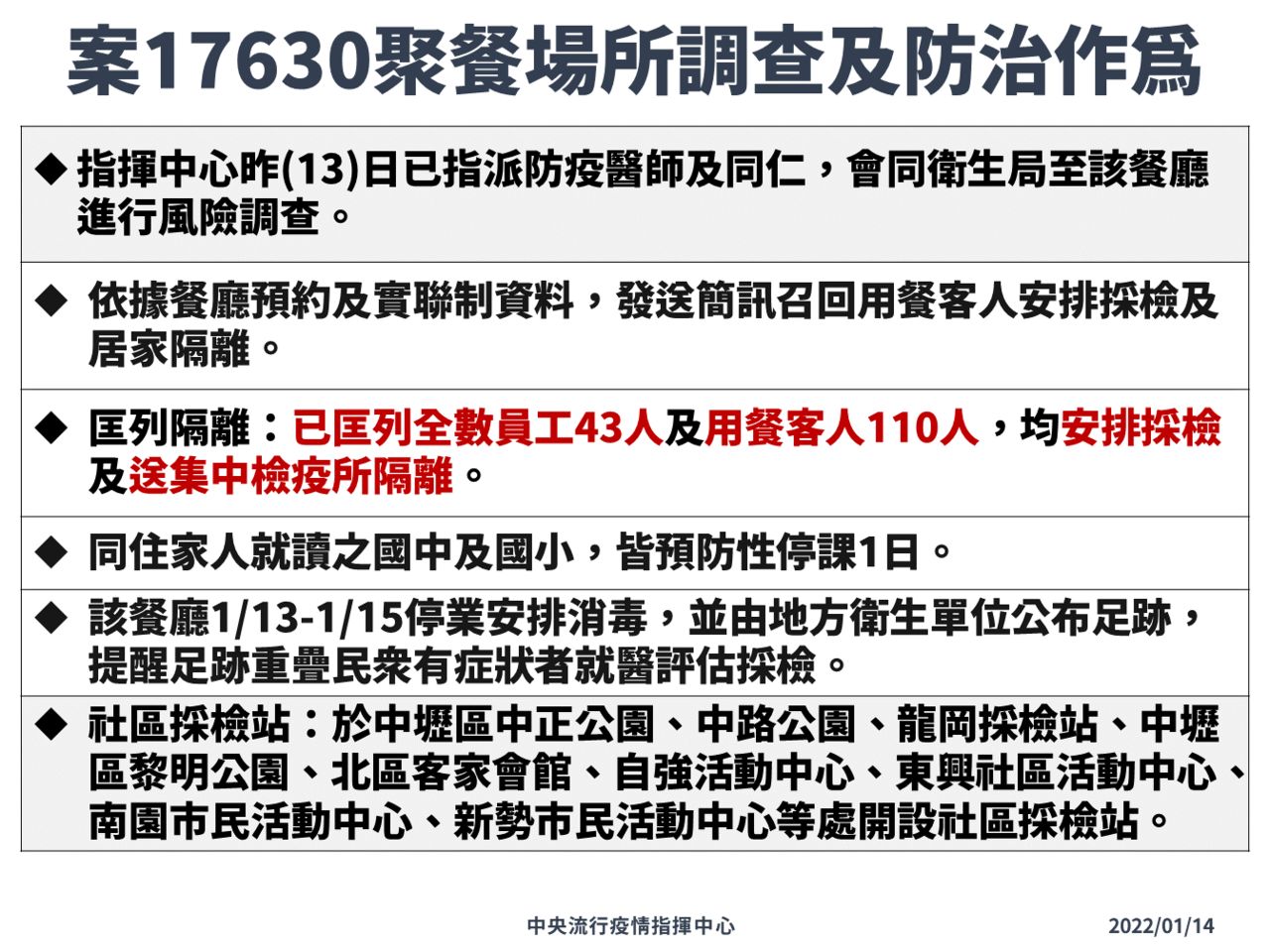 陳時中也提到,相關同住家人就讀國中小預防性停課一天,這餐廳在13~15號要安排消毒靜置,下午會新增兩個採檢所,一個南園市民活動中心,一個新勢市民活動中心,桃園縣社區累積九個社區採檢站。