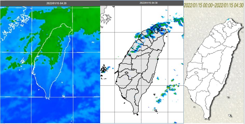 ▼今(15日)晨4:20紅外線色調強化雲圖(左圖)顯示,台灣上空有零散的中低雲。4:30雷達回波合成圖(中圖)顯示,中部以北有中低雲內的弱回波;僅桃園、新北沿海觀測到零星微量飄雨(右圖)。(圖/翻攝三立準氣象· 老大洩天機)