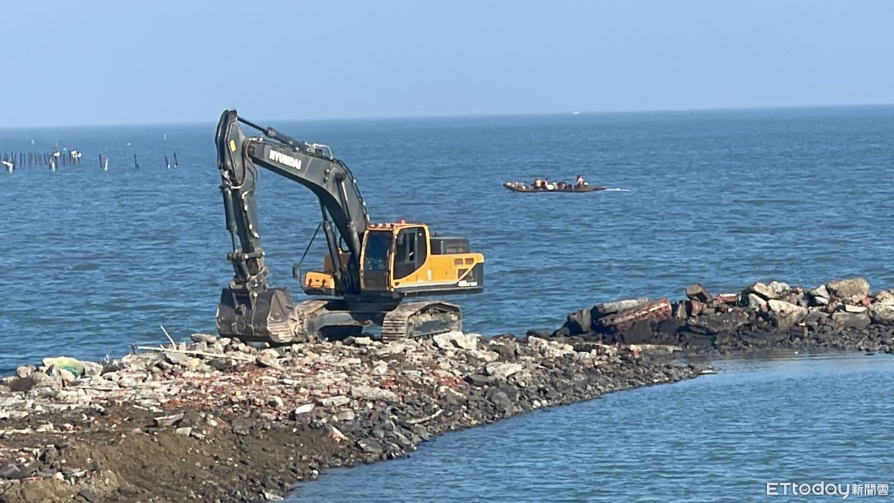 ▲怪手在海上築土堤方便大型機具進駐。(圖/記者吳世龍攝)