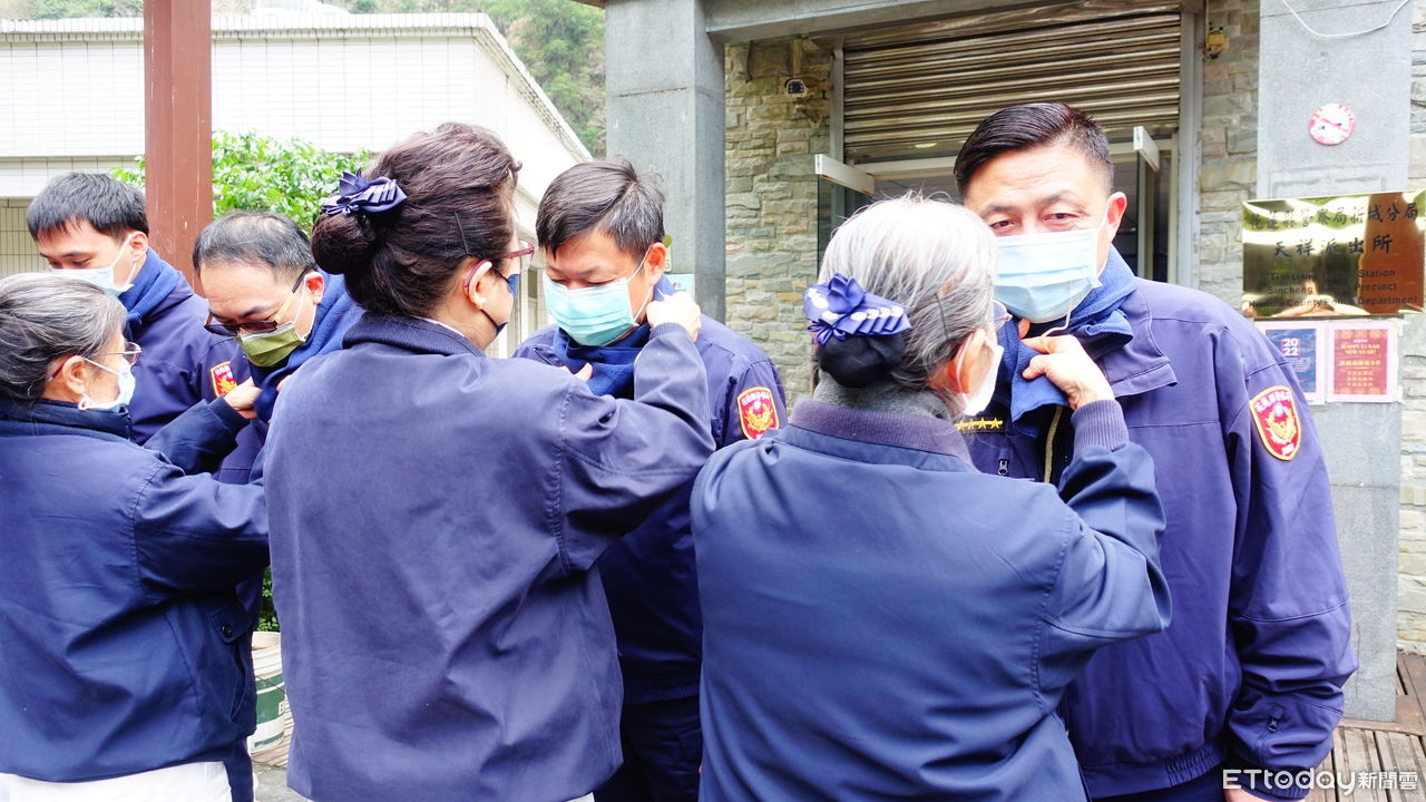 ▲志工獻上圍巾給合歡派出所員警,祝福他們值勤平安。
