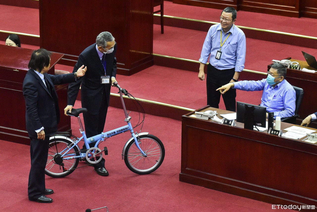 ▼王世堅贈送一台腳踏車以嘲諷柯文哲。(圖/記者李毓康攝)