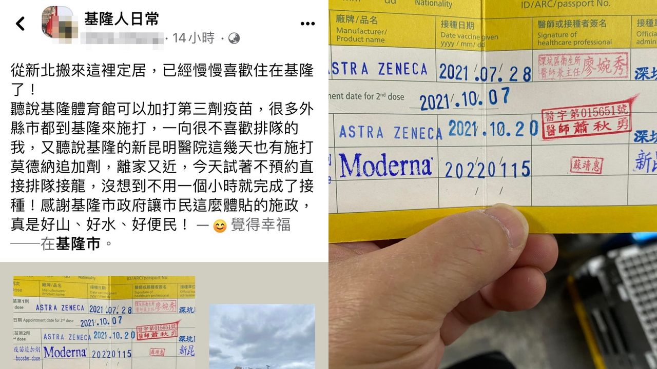 男網友在《基隆人日常》臉書社團提到,他從新北搬來這裡定居,已經慢慢喜歡住在基隆了!聽說基隆體育館可以加打第3劑疫苗,很多外縣市都到基隆來施打,一向很不喜歡排隊的我,又聽說基隆的新昆明醫院這幾天也有施打莫德納追加劑,離家又近,15日試著不預約直接排隊接龍,沒想到不用1個小時就完成了接種!感謝基隆市政府讓市民這麼體貼的施政,真是好山、好水、好便民!