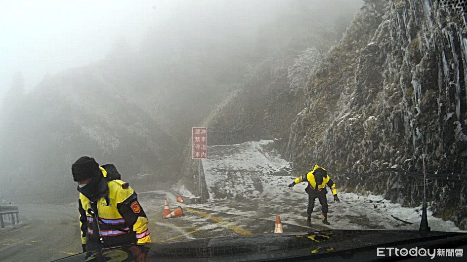 ▲奇寒降臨,合歡山出現沒有下雪,路面直接結冰的奇特現象,堪稱20年來僅見。(圖/新城分局提供,下同)