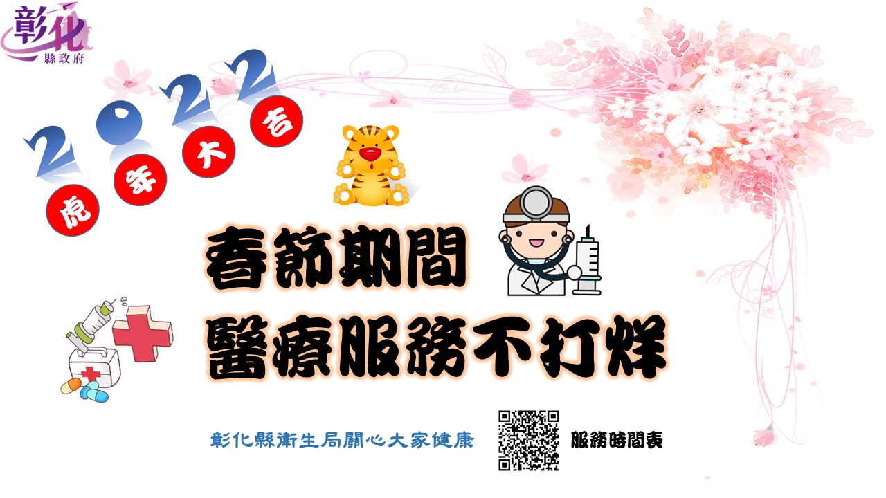 新冠疫情拉警報,彰化縣內醫院於小年夜至大年初五期間(1/30-2/5),仍提供門診、急診服務,縣內13家急救責任醫院全天24小時候診,另醫院春節門診時段及科別與平常不相同,衛生局也貼心的提供春節期間醫院醫療服務資訊上網,供縣民參考。