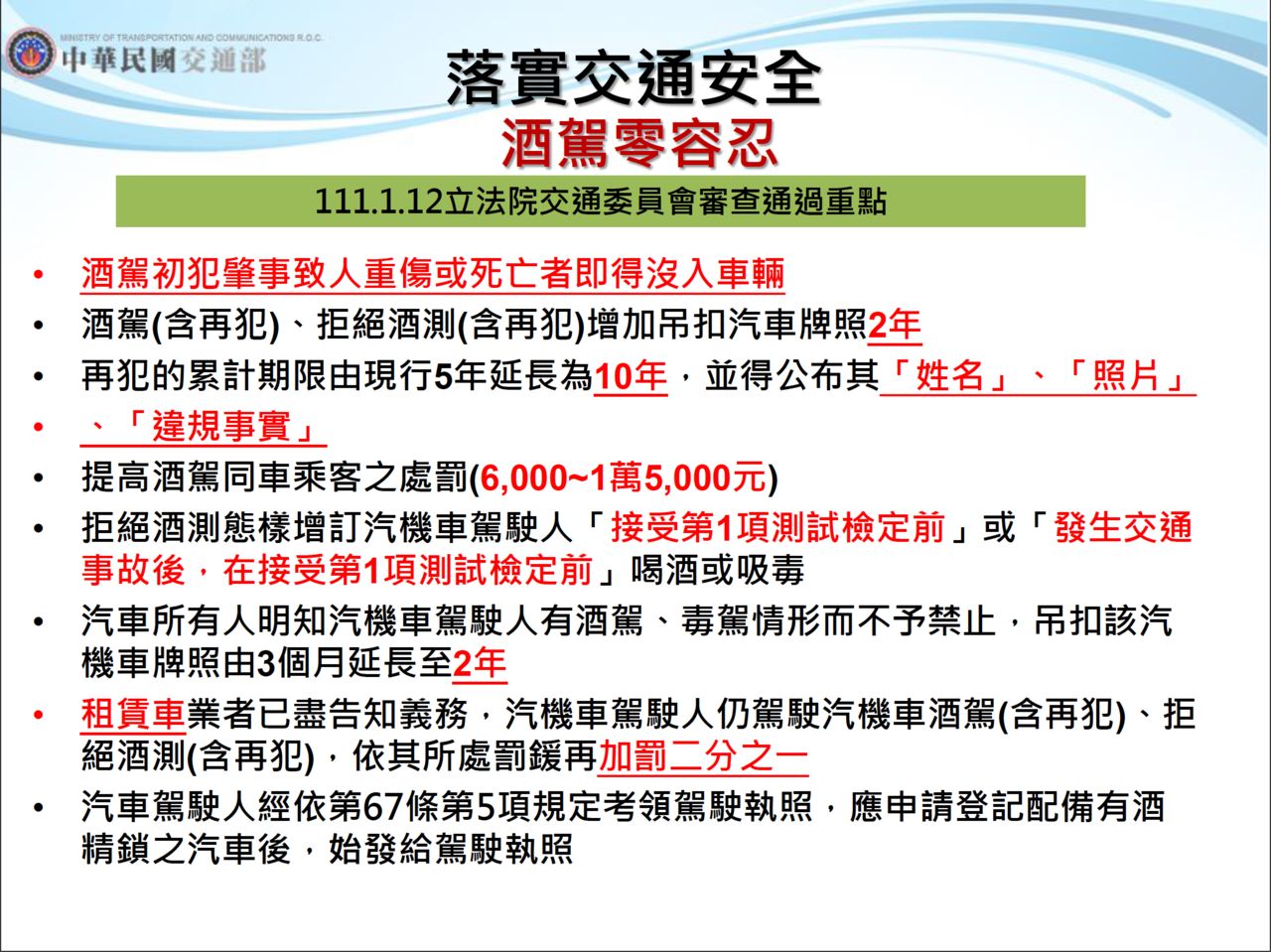交通部今天舉行2022年新春記者會,交通部長王國材報告,今年1月12日立法院交通委員會初審通過「道路交通處罰條例」第35條修正案,通過審查重點包括酒駕初犯肇事致人重傷或死亡者,即可沒入車輛,並增列酒駕、拒絕酒測者可吊扣汽車牌照2年。