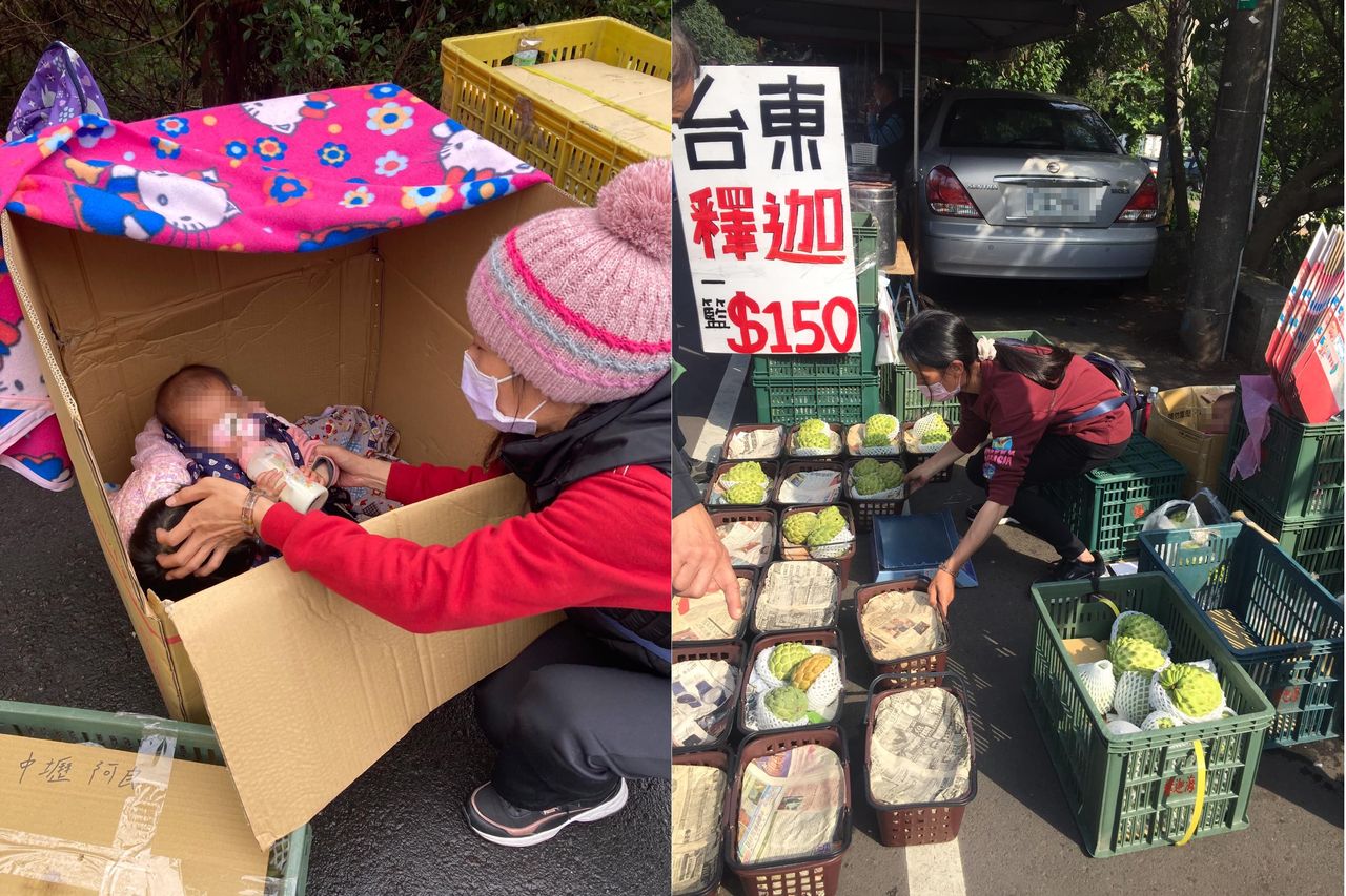 ▲釋迦媽媽用紙箱當成孩子們的嬰兒床,邊顧娃邊擺攤。(圖/翻攝自桃園媽媽-李柏瑟粉絲專頁)