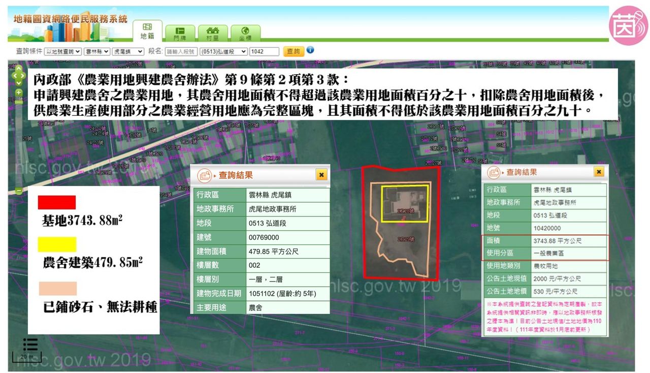 林楚茵揭露,根據《農業用地興建農舍辦法》第九條規定,農舍用地面積不得大於農地面積的10%,同時應要保留90%以上供農業生產使用的完整區塊,經她查詢內政部的地籍圖資網路便民服務系統,發現張家青埔宮的農舍是個大違建,因其農舍面積超過了農業用地的10%,剩下的土地也多被作為車道和植栽,真正可以農用的面積已所剩無幾。