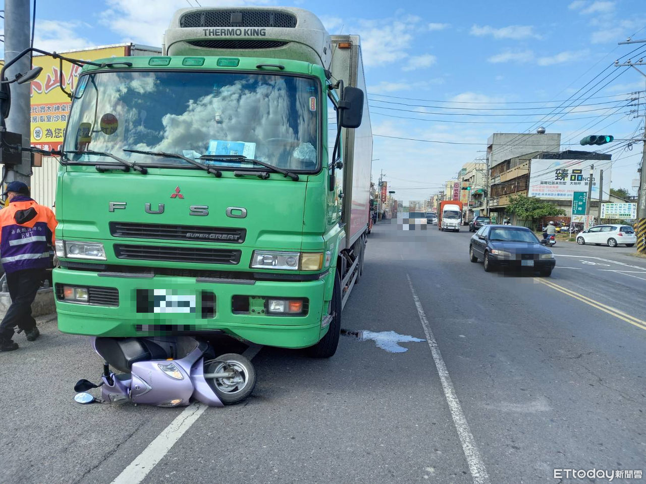 ▲新港往北港路上大貨車撞倒機車騎士,女騎士當場爆頭死亡 。(圖/記者翁伊森翻攝)