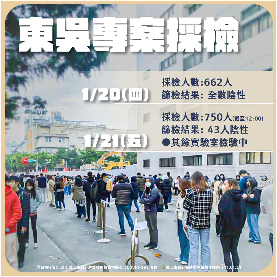 北市確診個案增加3例,分別為案18181的75歲阿嬤、案18182的東吳大學進修部學生、案18175的30多歲女性。市長柯文哲今(21)日下午召開疫情記者會說說明應變措施。針對東吳個案,昨採檢662人皆為陰性,今續採檢750人,目前43人陰性,其她仍持續檢驗中。