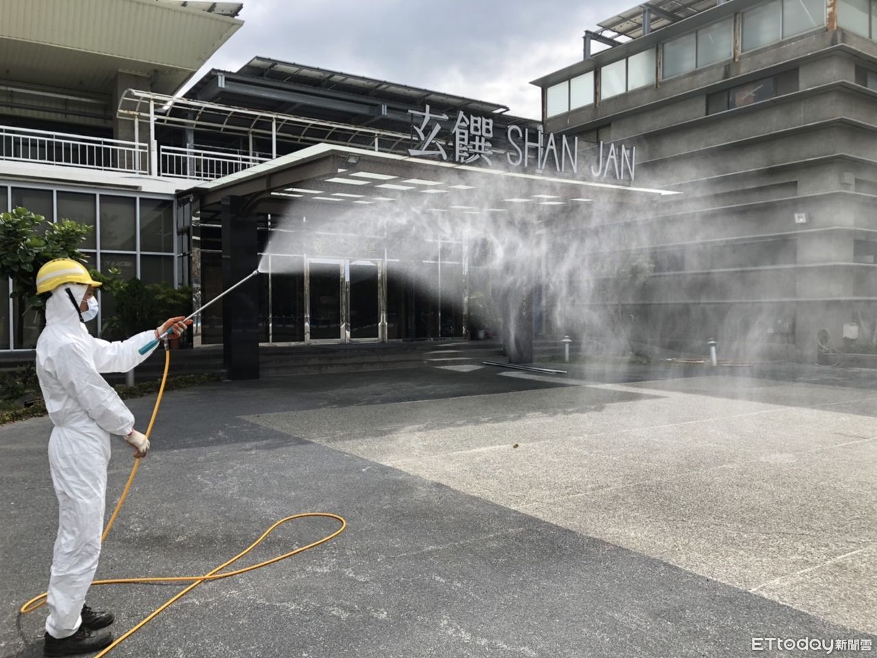 ▲消毒人員對台南玄饌宴會館進行大清消 。(圖/記者林悅翻攝)
