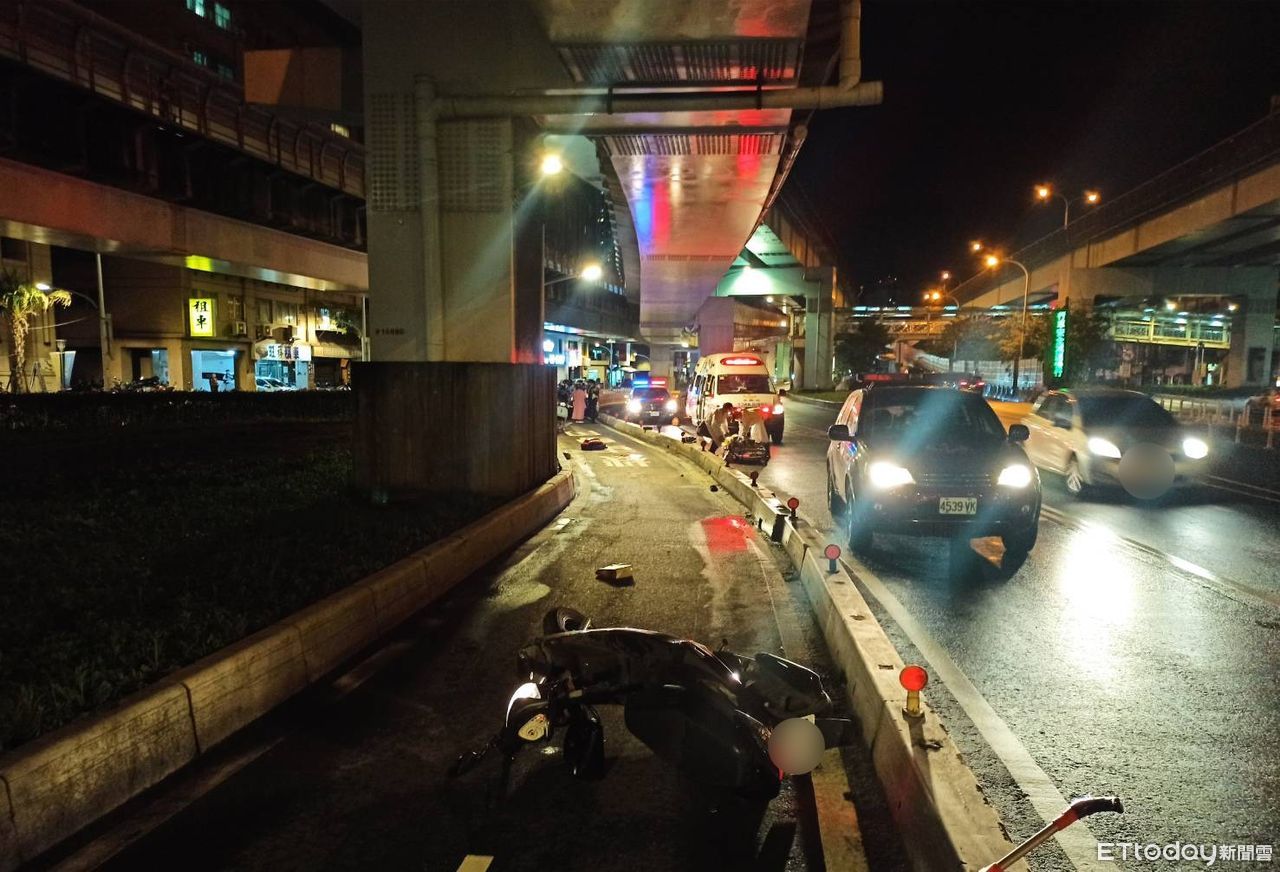 ▲▼女騎士(紅圈處)自撞橋墩後倒地,救護人員趕緊將其送往衛生福利部臺北醫院救治,於22日0時30分宣告不治。(圖/記者陳雕文翻攝)