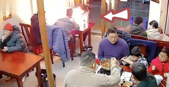 ▲桌上卡式爐突發生爆燃,顧客秒閃頭迴避。(圖/翻攝安徽消防微博)