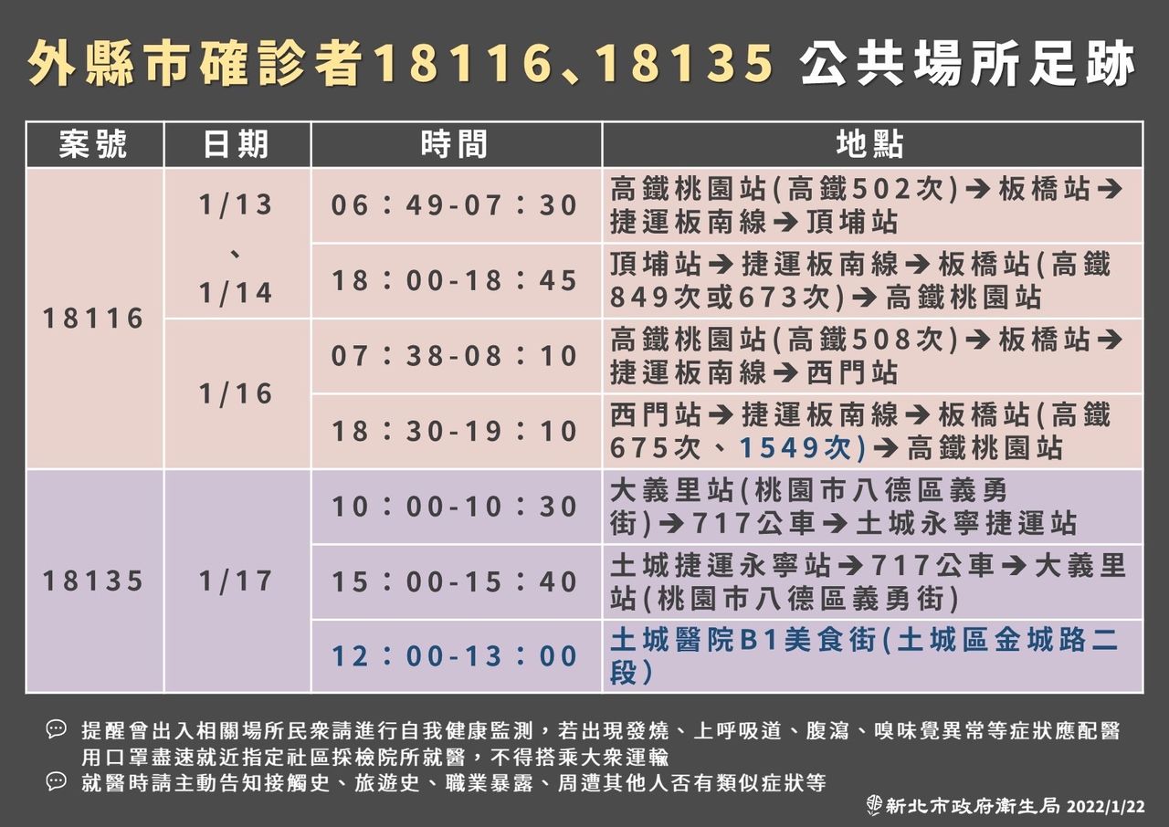 新北衛生局22日公布案18116在新北的足跡,包括高鐵板橋站﹑土城醫院美食街、北捷西門站、永寧站、頂埔站等。另外,日前曾赴桃園大湳市場買菜、在科技廠上班的染疫員工(案18135)再增加一處足跡,為土城醫院B1美食街。