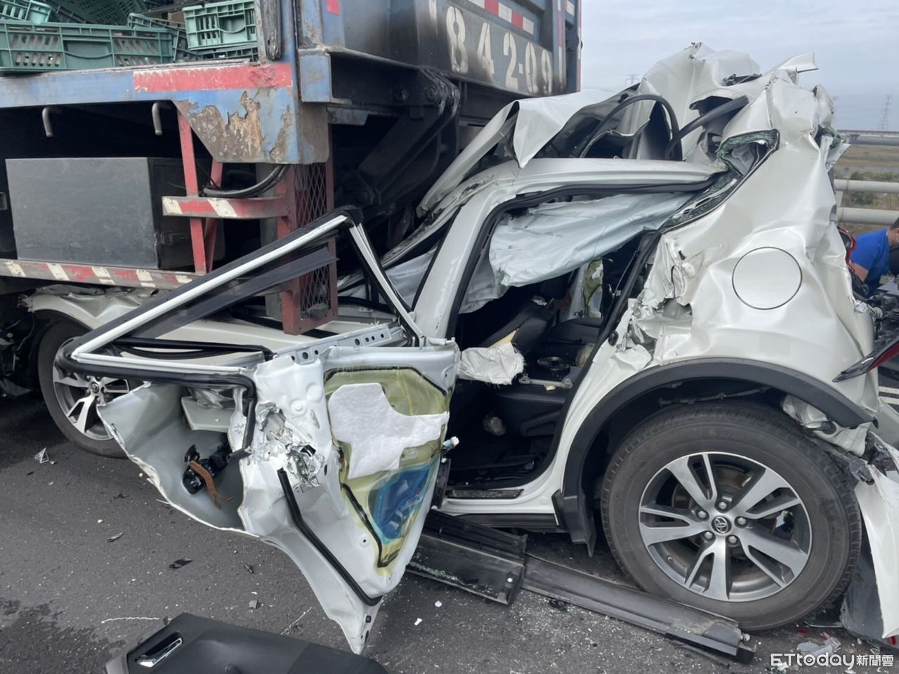 彰化縣伸港鄉台17線、中彰大橋南下路段今天上午10時許傳嚴重車禍,一輛白色休旅車遭一輛貨車跟砂石車前後夾擠後變成廢鐵,車上1男1女受困車內。警消獲報後,派遣龍井、沙鹿及大肚分隊,出動消防車3輛、救護車2輛、人員12名,由龍井分隊長王文暉帶隊前往搶救。