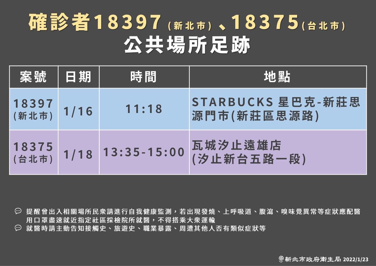 新北市衛生局表示,案18397為20多歲男性,1/17晚間與朋友(北市士林區確診個案18375)等4人相約聚餐,1/18因為喉嚨痛、流鼻水到診所就醫,1/22接獲台北市朋友告知確診消息,自行到醫院採檢,PCR陽性,Ct值19.4,收治專責病房隔離治療。