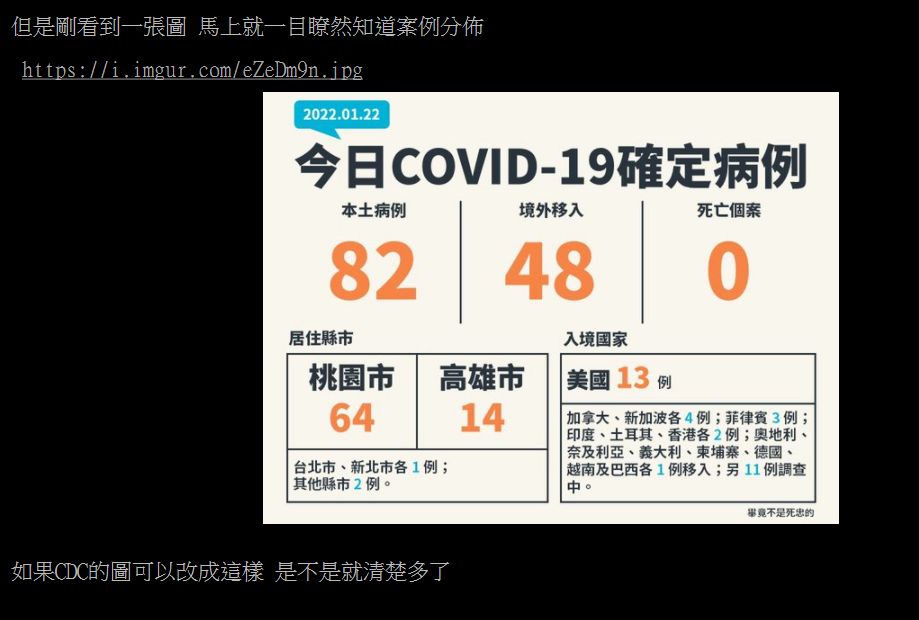 有網友PTT以「如果CDC圖改成這樣會不會比較清楚」為題發文表示,本土疫情嚴重,台灣又小,在高雄染疫都可以能跑到台北,因此民眾都關心哪邊的確診人數最多,至少可以避免前往造成群聚,但觀看這兩天指揮中心的病例圖,卻發現留了很大的區域給境外移入的解說,「根本沒幫助,反觀本土案例只有數字」,因此重新修改22日的圖並PO出詢問,「如果CDC的圖可以改成這樣,是不是就清楚多了」。
