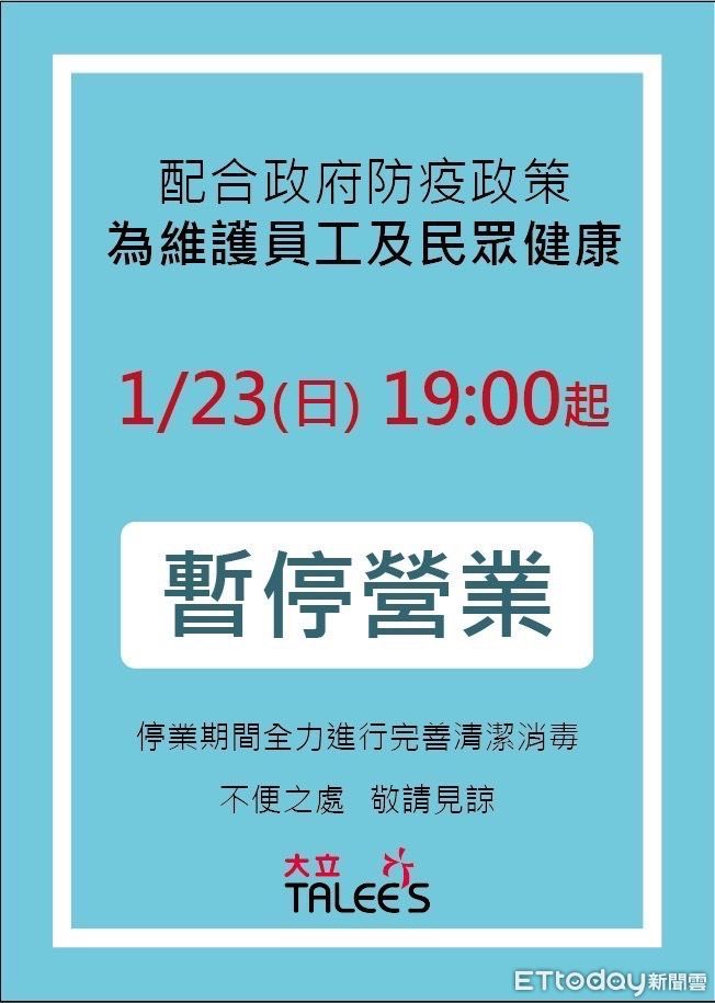 高雄市大立百貨剛剛稍早宣布今天晚上七點緊急停業閉館清消,主要有確診者在1月10日時候有來到大立百貨,大立百貨的公關人員證實此事,同時表示是在發病前14天來過,接獲衛生局通知閉館清消。