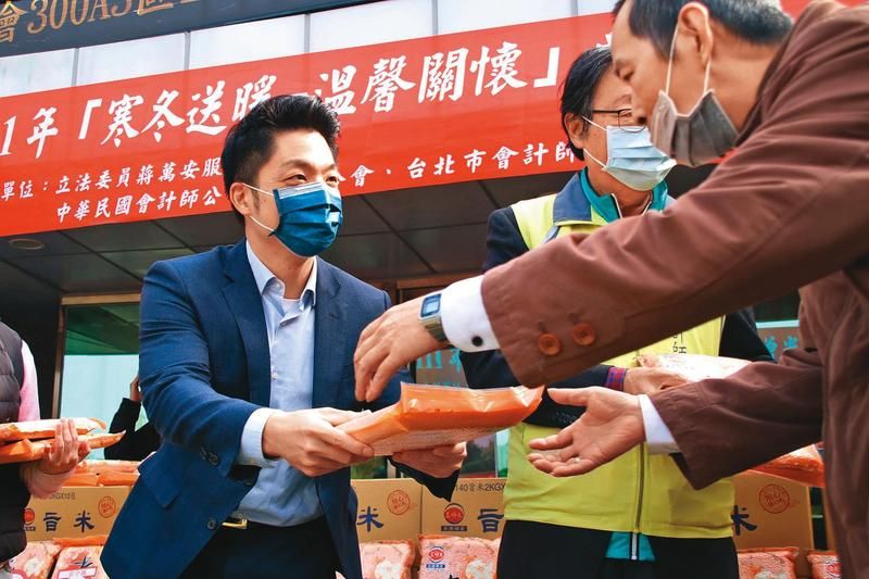 ▲蔣萬安(左)勤跑基層,日前與會計師公會共同舉辦贈米活動,關懷弱勢。