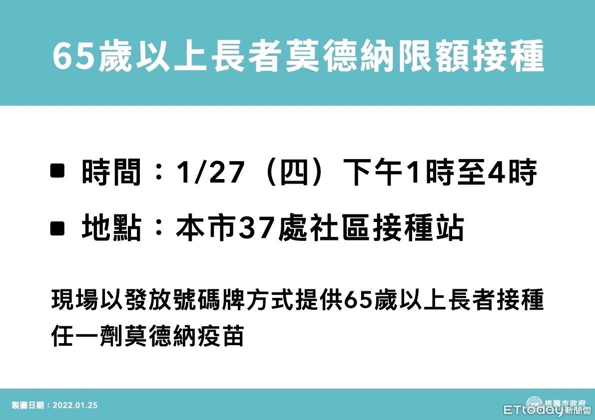 針對桃園市最近爆發多起確診個案,市長鄭文燦25日在防疫專案會議上表示,為提高桃市疫苗覆蓋率,1月27日將由各區里統通知65歲以上長者至各社區接種站接種莫德納疫苗;另外,1月28、29日與2月4、5日將在桃園巨蛋、桃園市榮民服務處各設置1處接種站,開放免預約施打第一至三劑BNT及高端疫苗。