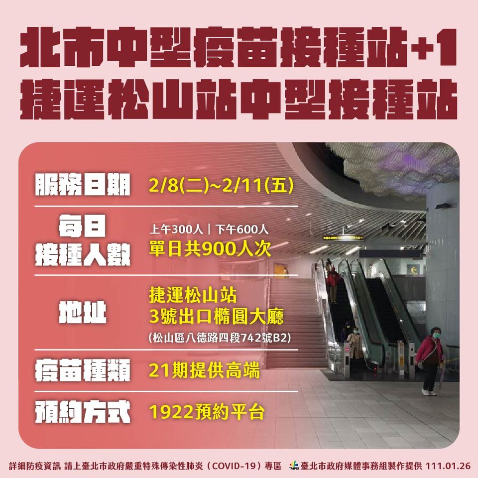 台北市再加開疫苗接種站,副市長蔡炳坤今(26)日下午下午於疫情記者會宣布,捷運松山站加入疫苗接種站的行列,2月8日至2月11日提供民眾接種高端疫苗。