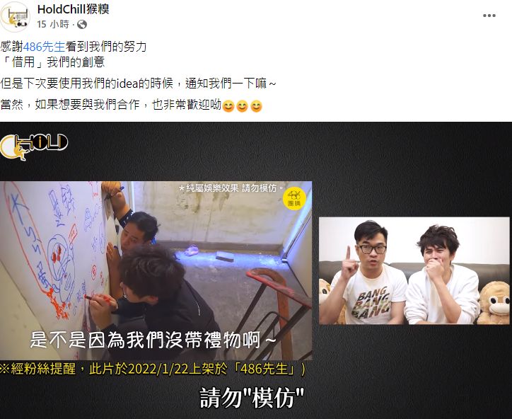 「HoldChill猴糗」兩名主持人26日在臉書粉專狠酸,「感謝486先生看到我們的努力『借用』我們的創意」,更痛批「他們真的是拍得『抄』好的。」對此,486先生急上火線道歉,不過一開始的道歉文不見了,事後又PO了一篇制式的聲明文,引發網友熱議。