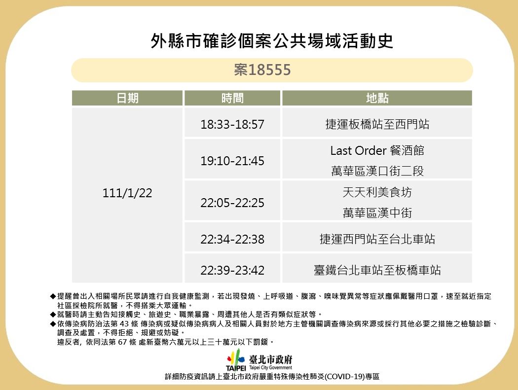 桃園市一名20多歲女性(案18555)於日前自行快篩陽性後,再到醫院採檢確診,Ct值28,感染源仍待調查中。台北市衛生局27日公布相關足跡,1月22日曾經搭乘捷運板南線,並到過Last Order餐酒館、天天利美食坊,其中天天利美食坊還是總統蔡英文2019年走訪西門町時,帶著幕僚一同用餐的餐廳。