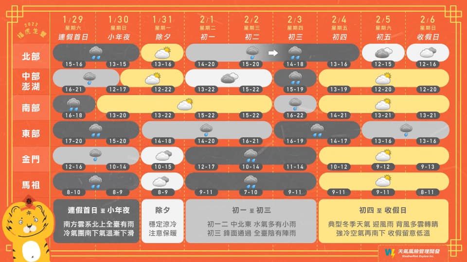 小年夜北部、東半部、中南部山區仍有短暫陣雨,中部平地上半天亦有零星降雨,南部則漸趨穩定多雲至晴;夜間氣溫探底,至除夕清晨最冷,市區低溫12-14度,北部、西半部近山、空曠區域低溫可達10-12度。