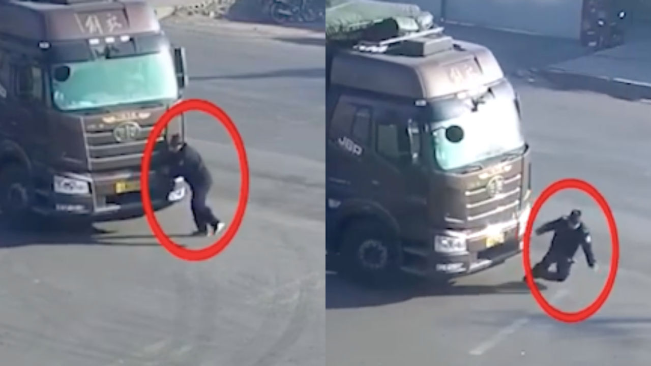 事發影片可見,當時,旁邊一名保全人員立刻走過來,以「肉身擋車」的方式,抬手撐著貨車阻止前行,但貨車仍舊往前行駛,並開始加速;這時保全人員驚覺不妙,立刻要跑開,但貨車徑直開過,他逃脫不及整個人遭捲入車底,活活被輾死。