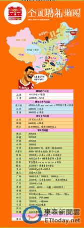 聘金絕對是有情人要成眷屬的關卡之一,陸媒最近公布一份聘金地圖(見下圖/取自網路),台灣「被迫」進入排行榜中,以16萬排在香港前面,拿下第16名。「揪感心」的重慶女則以0元出嫁拿下最便宜新娘的封號,但也讓不少大陸男網友說,該去重慶討個老婆囉!