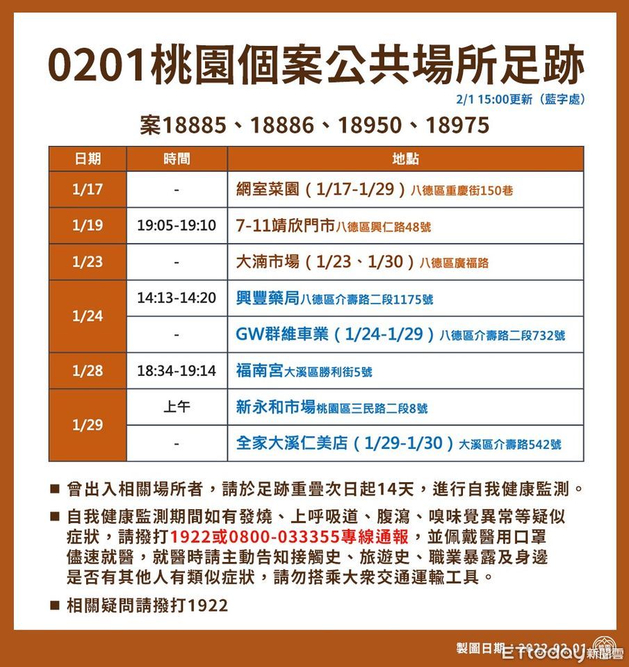 另外,桃園市府上午也公布3處確診者足跡,包括八德網室菜園、7-11靖欣門市及大湳市場,提醒足跡重疊民眾進行自我健康監測,若出現發燒、喉嚨痛、咳嗽、頭痛、打噴嚏、流鼻水、疲勞等疑似症狀,請儘速撥打1922或0800-033-355防疫專線通報,並至指定院所採檢。