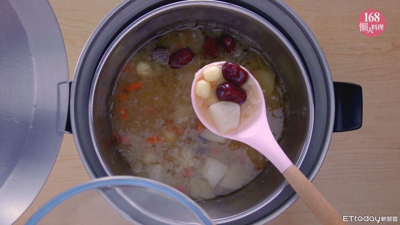 台灣俗話說「吃甜甜好過年」、「吃甜甜賺大錢」,年假期間來道甜點不僅滿足口腹,更能討個吉利。《168懶人料理》示範只要5步驟就完成冷熱皆宜的銀耳蓮子湯,用電鍋煮出滿滿膠質,最適合當成年菜收尾的美味。