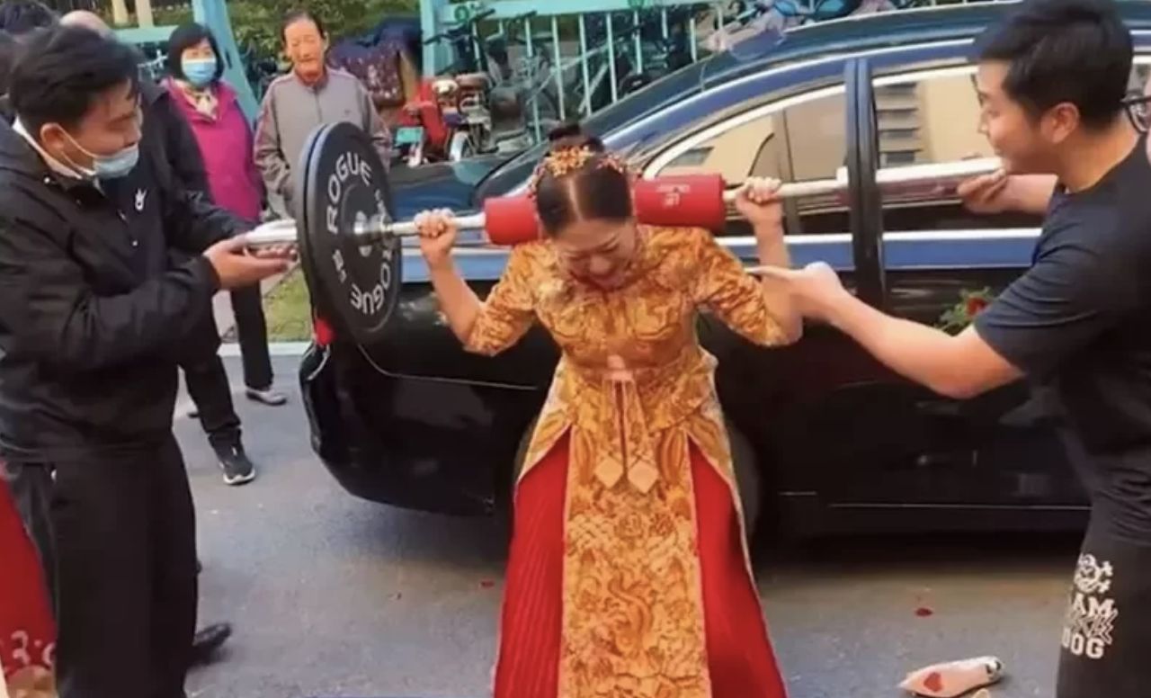 婚禮當中不時有玩新郎、新娘的環節,目的大多為了增添氣氛,而非刻意刁難。大陸近日再流傳一段婚鬧片段,親友為了「惡整」新娘,竟準備一個20公斤重的槓鈴,要她現場負重做深蹲,更承諾每做一下將給予100元人民幣(約新台幣435元)。新娘聞言化身女漢子,輕鬆背起槓鈴做出20下深蹲,另所有人全部看傻。