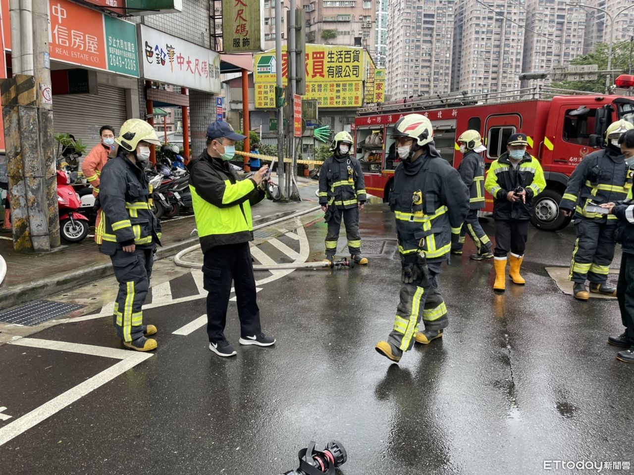 ▲汐止區大同路2段5日上午發生瓦斯漏氣滲出路面災情,警消封鎖現場灑水戒備。(圖/記者張君豪翻攝)