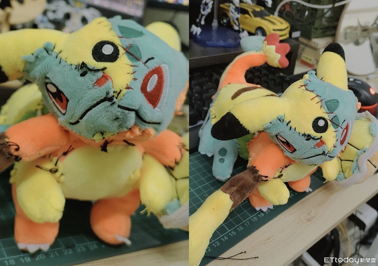 照片中可以看見,原PO把皮卡丘、小火龍、妙蛙種子及傑尼龜等4隻寶可夢娃娃分解在縫合,最後變成一隻長相詭異、體型巨大的詭異娃娃。