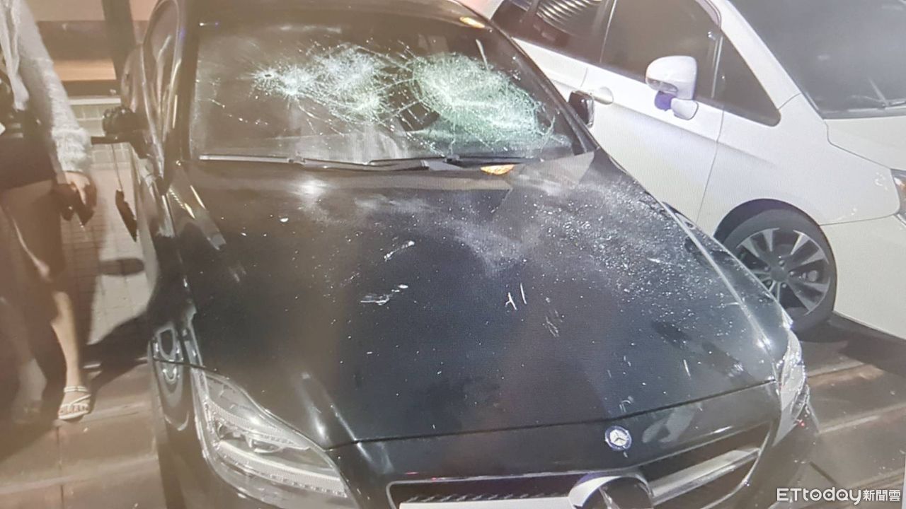 ▲黑色賓士遭砸毀、擋風玻璃碎裂。(圖/記者陳以昇翻攝)