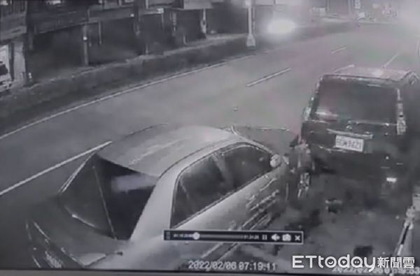 ▲劉姓男子深夜駕車未開大燈衝撞路旁停車。(圖/記者楊熾興翻攝)