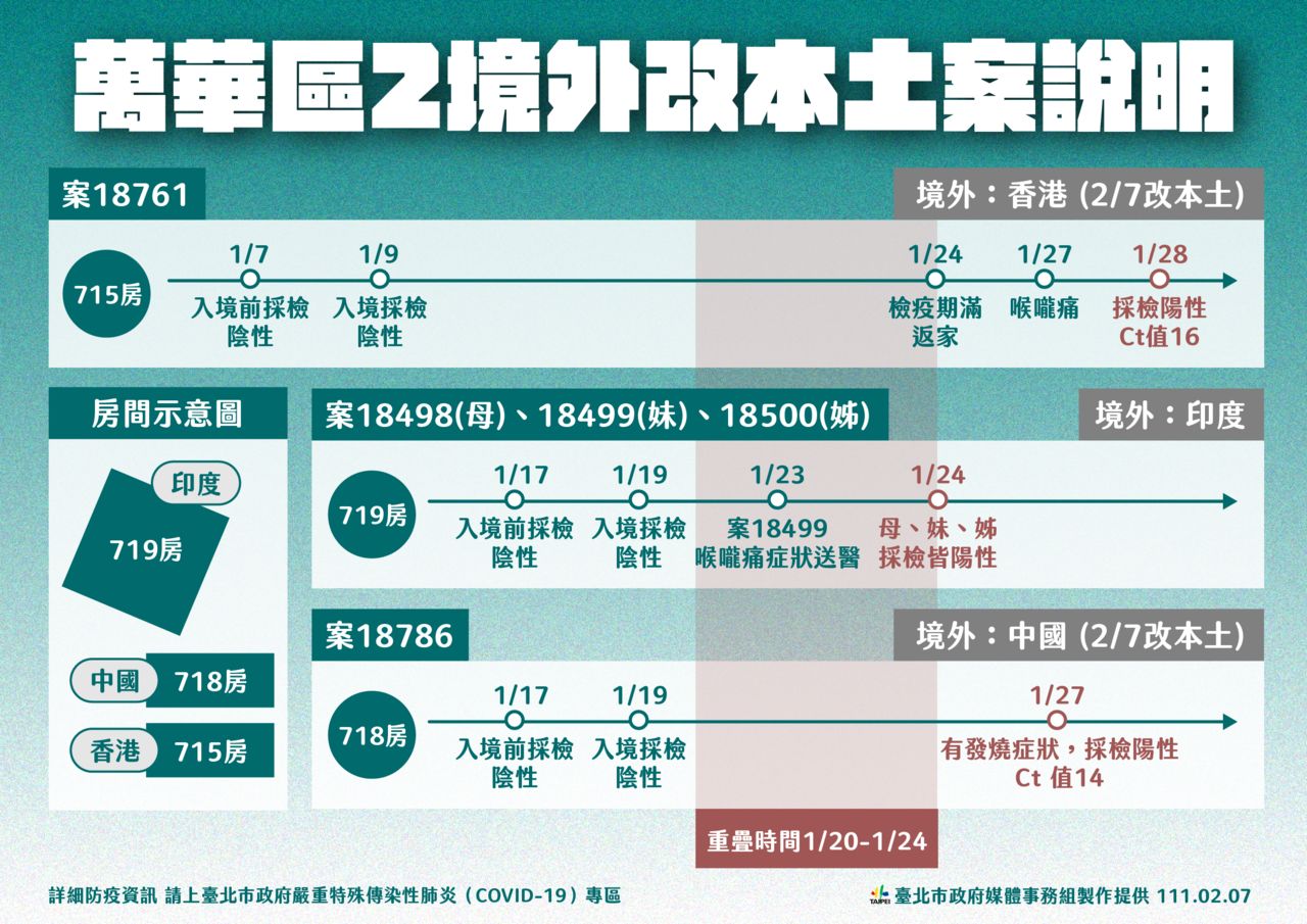 柯文哲7日於防疫記者會說明,北市今天沒有新增感染案例,但有2例境外移入舊案改判本土;因為萬華某防疫旅館1月24日有3例印度境外移入的母女3人(案18498、案18499、案18500),這個屬於境外移入,一開始就在防疫旅館被攔下來 ,所以沒有足跡問題。