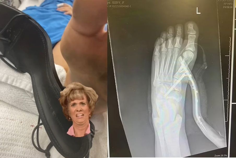 澳洲一名女子在家時發現天花板躲了一隻超大蜘蛛,把她嚇得立即從床上跳了下來,沒想到落地時腳慘被7公分高跟鞋刺穿,恐怖畫面把醫護人員也嚇了一大跳,最後緊急手術才順利把鞋跟取出來。