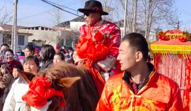 據《極目新聞》報導,結婚現場畫面顯示,78歲的老大爺胸前佩戴大紅花、身披新郎官服、戴著墨鏡,騎著駿馬不斷向路人揮手;新娘則坐在多人抬的紅色轎子裡,沿途圍滿了看熱鬧的村民,人們紛紛拿出手機拍照。