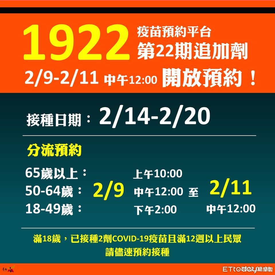COVID-19公費疫苗預約平台22期,將於9日至11日中午12時開放分流預約,接種期間為2月14日至20日;8日下午2時起可至平台查詢預約資格,提醒年滿18歲,已接種2劑COVID-19疫苗者儘速預約接種追加劑。