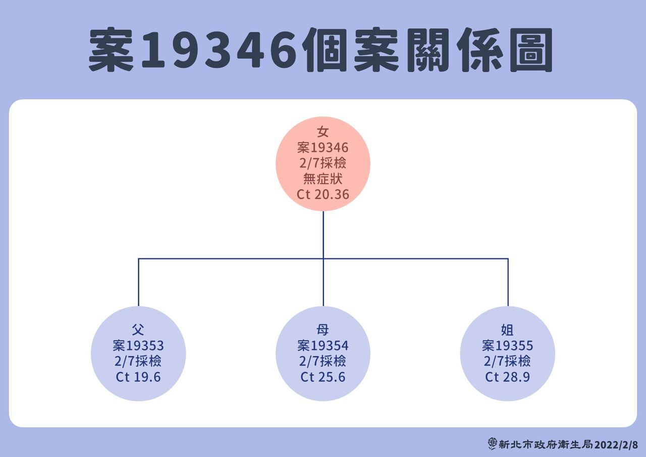 根據指揮中心資料,新北這4例個案是一家四口的妹妹(案19346)因為生病不舒服自我快篩發現陽性,後續其父親(案19353)、母親(案19354)、姐姐(案19355)3人接觸者採檢確診。