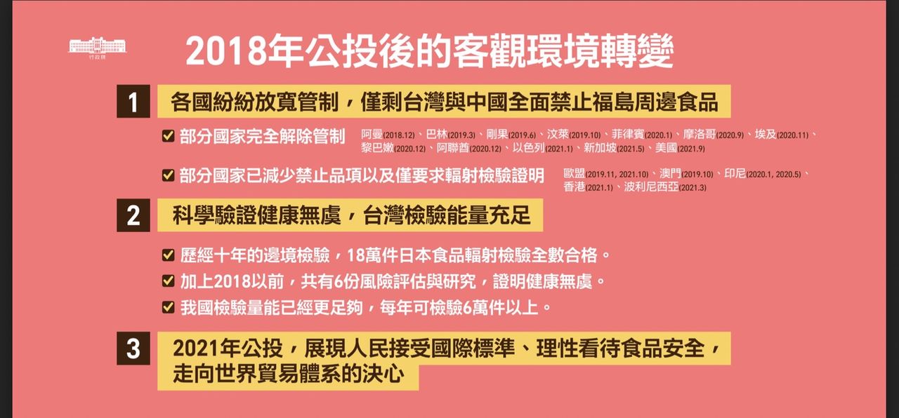 根據行政院提供的公開資料顯示,歷經10年的邊境檢驗,18萬件日本食品輻射檢驗全數合格,2018年以前,共有6份風險評估與研究,證明健康無虞,而台灣檢驗量能也已經足夠,每年可檢驗6萬件以上。