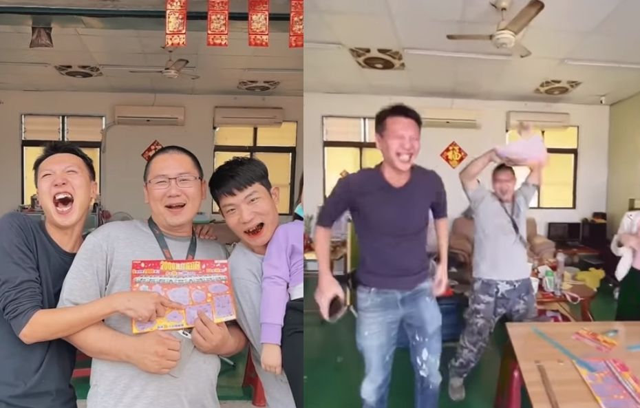 其中一名股東的妻子將當時的影片上傳到臉書,畫面中可見,共有6、7人圍在桌邊一起見證刮開的百萬元獎項,負責刮的男子還特別數出「這個啦!個、十、百、千、萬、十萬、百萬,一百萬!」