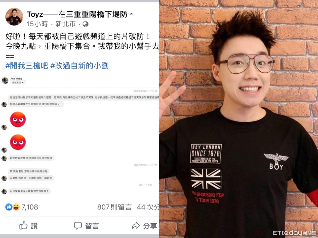 ▲Toyz在臉書貼文相約晚間9點重陽橋開我三槍 。(圖/記者陳以昇翻攝)